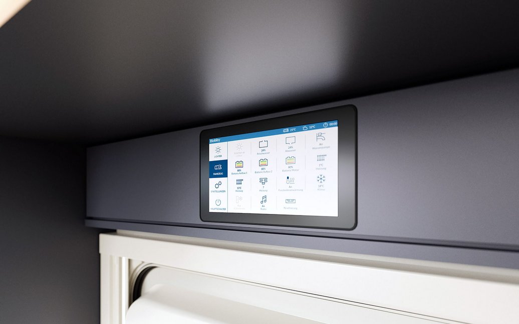 Alle Hobby-Fahrzeuge sind serienmäßig mit einem computergesteuerten Bordmanagementsystem ausgestattet. Damit lassen sich alle elektronischen Fahrzeugfunktionen wie z.B. Heizung, Batterie, Klimaanlage, sowie Licht und Frischwasser-Füllstände ganz einfach überwachen und steuern – bequem per Hobby-Bedienpanel im Eingangsbereich oder über Bluetooth per HobbyConnect-App.