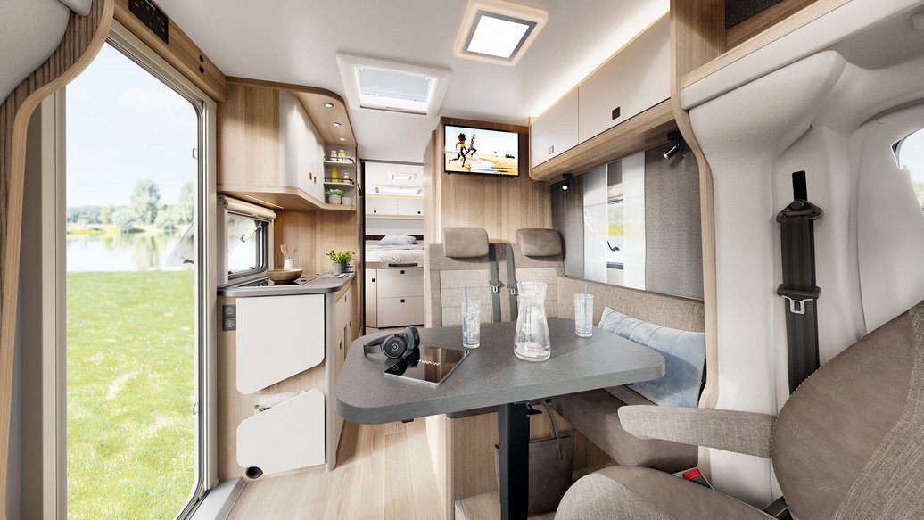 Skandinavisches Design und nordisches Hygge machen dieses Womo zum Traumort für alle, die sich Gemütlichkeit und Style in einem Reisemobil wünschen: der MAXIA T. Für dieses Wohnmobil hast du die Wahl zwischen Grundrissen Einzelbetten und einem gemütlichen französischen Bett.