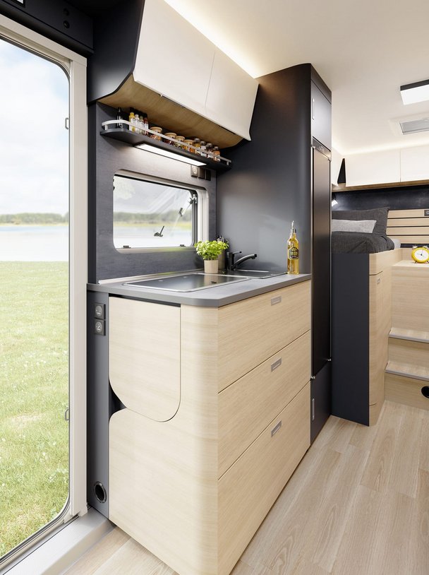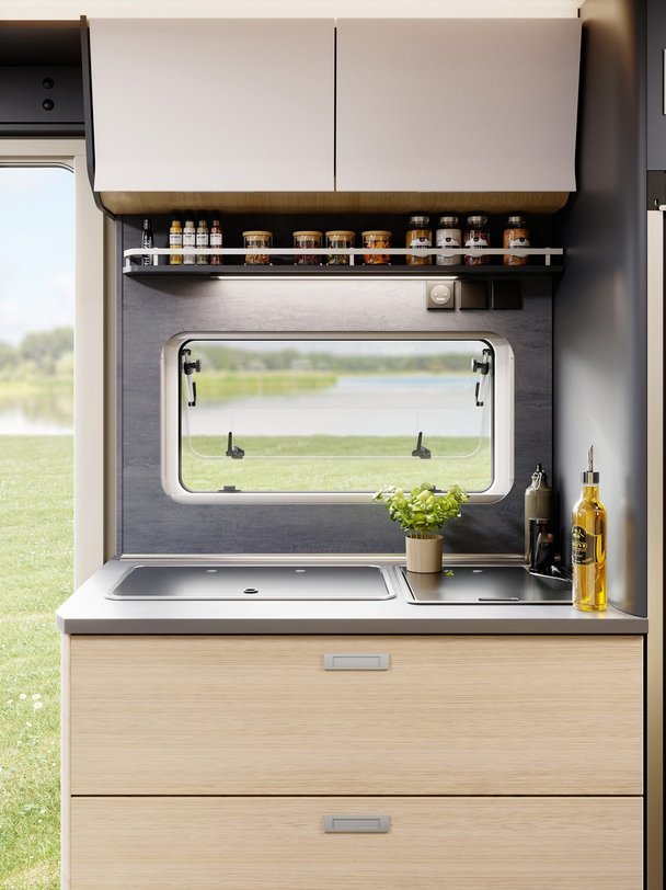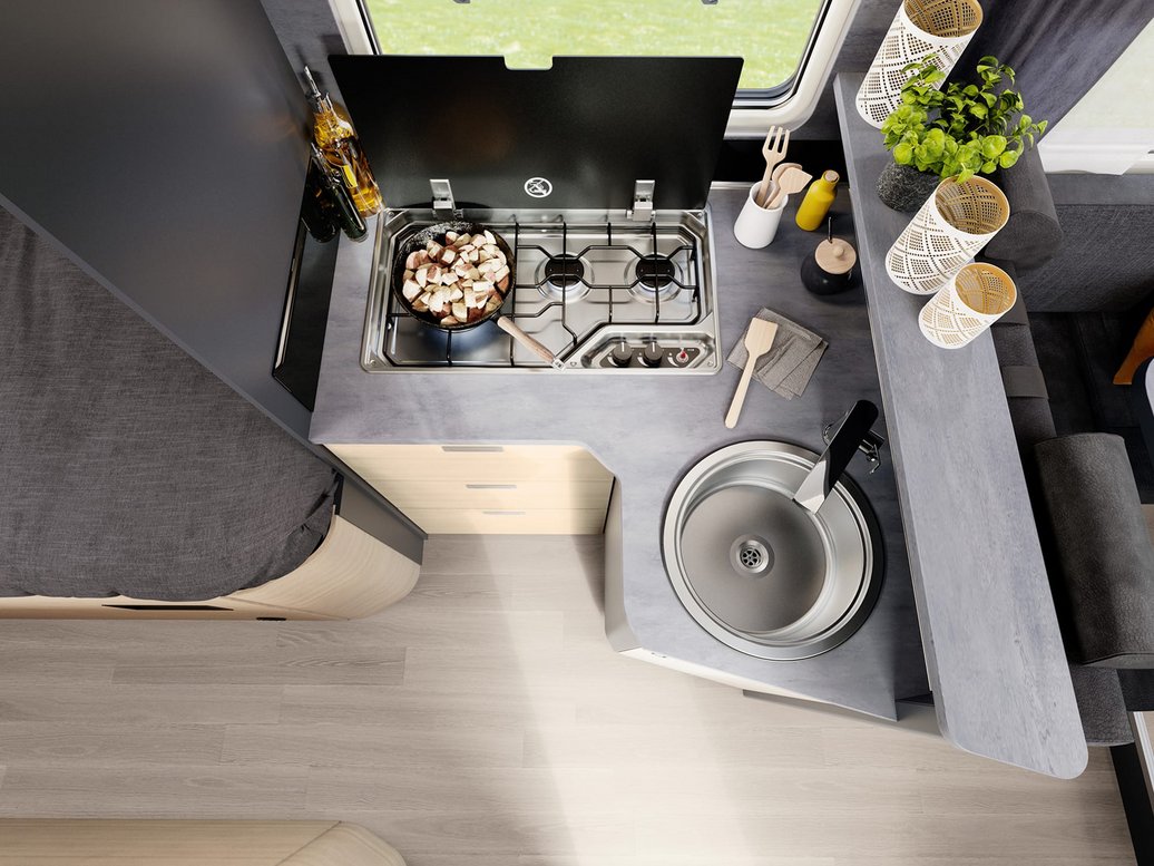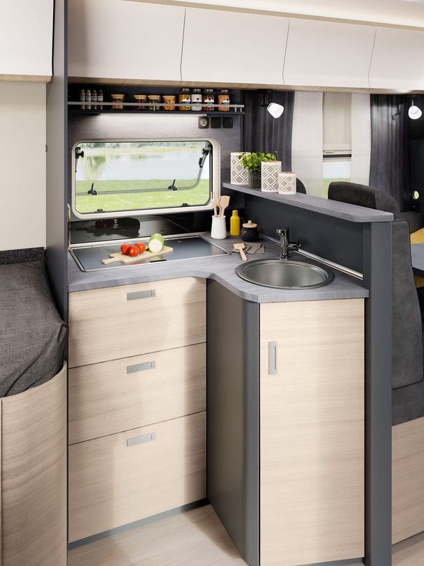 Winkelküche mit Mini-Tresen im 740 WF und WE oder Seitenküche im 710 GE? Je nach Modell mit einem 2- oder 3-Flamm-Kocher und einer Spüle aus Edelstahl, 133 L-Kühlschrank, geräumigen Schubladen, großer Ablage- und Arbeitsfläche, extra langem Gewürzboard machen beide Varianten sowohl Hobby-Köche als auch Fertiggericht-Künstler glücklich.