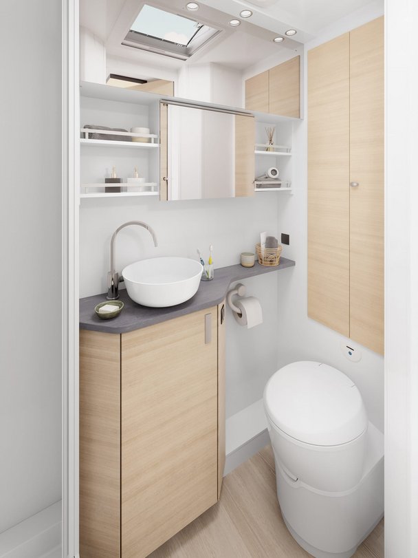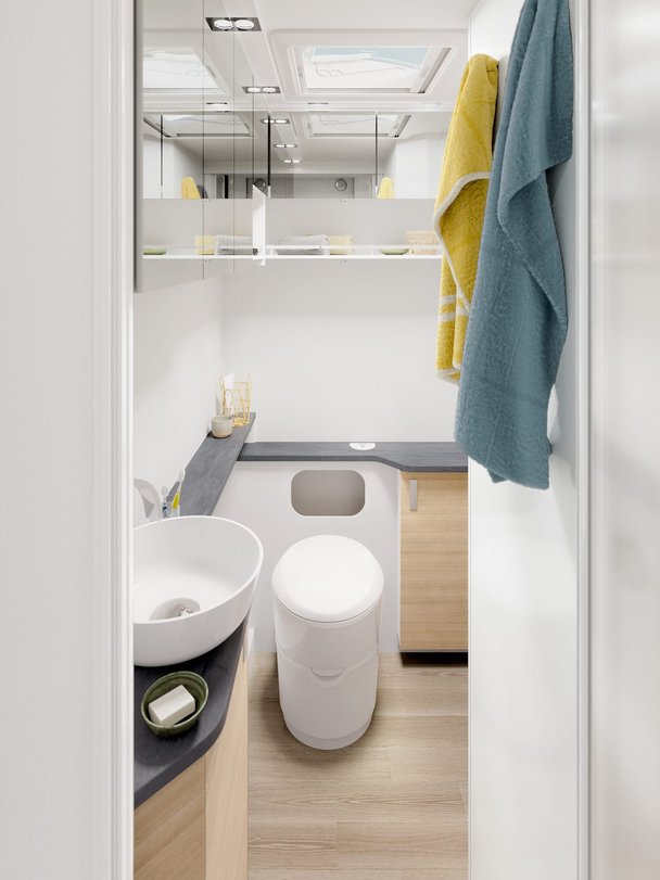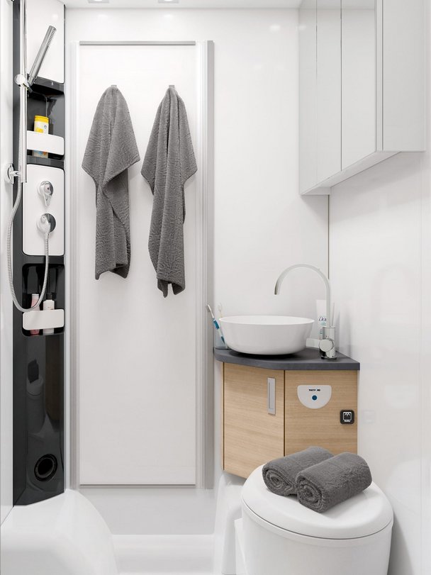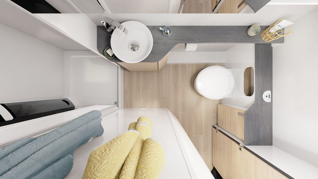 Das extragroße Bad im Heck des T 740 WE und T 740 WF erstreckt sich über die gesamte Fahrzeugbreite. So nimmst du deinen gewohnten Komfort für deine Pflegeroutine einfach mit.
