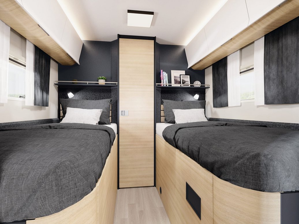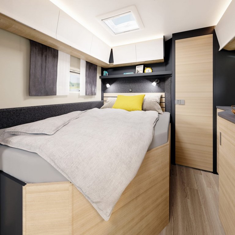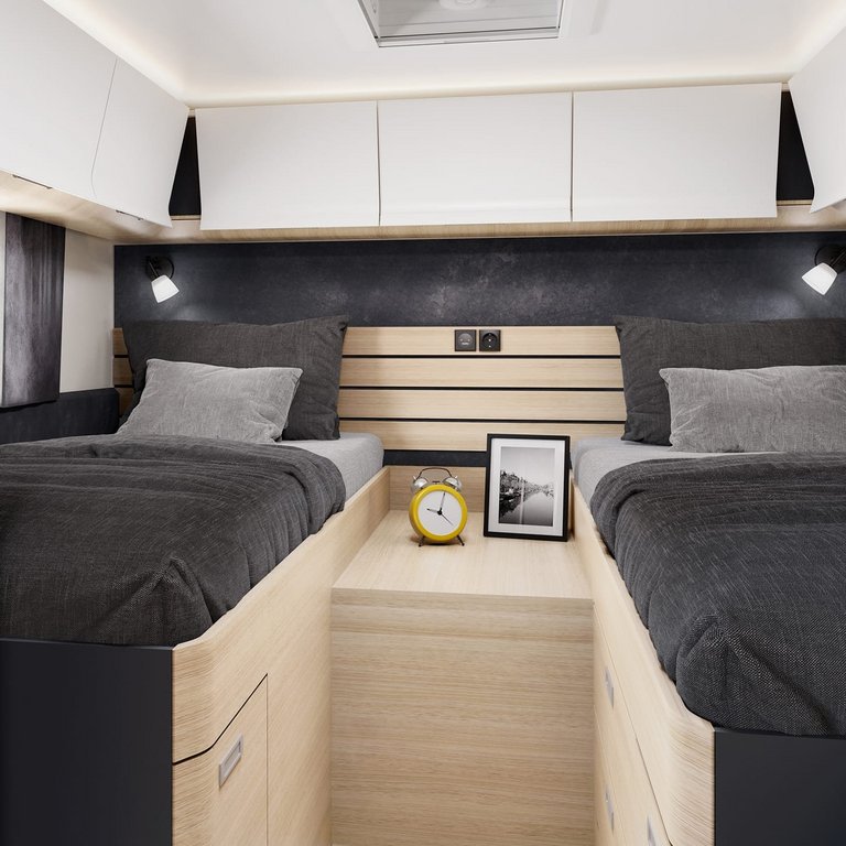 Im Hobby Maxia T hast du die Wahl, denn die Grundrisse bieten unterschiedliche Schlaflösungen – ganz nach deinen Vorlieben. Ob zwei bequeme Einzelbetten mit offener Raumwirkung oder ein großzügiges französisches Bett – beide Varianten punkten mit hochwertiger Matratze, angenehmer Liegehöhe und wohnlichem Design. Dank cleverer Stauraumlösungen und durchdachter Beleuchtung wird dein Schlafbereich zur persönlichen Komfortzone – für erholsame Nächte, wo immer du bist.