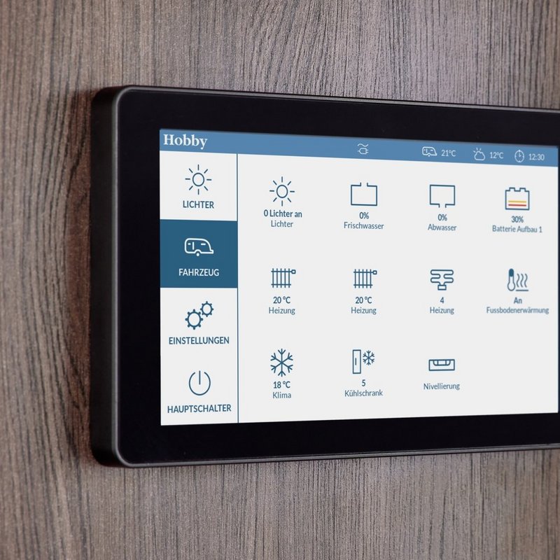 Toutes les fonctions de la gestion embarquée peuvent non seulement être affichées et utilisées via l’appli HobbyConnect, mais également via le panneau de commande standard de série situé dans l’entrée. Il est facile à utiliser grâce à des symboles clairs et réagit très rapidement. Dans les séries MAXIA et PRESTIGE, un panneau de commande tactile 7“ moderne avec affichage de la mise à niveau est même disponible de série et en option pour tous les autres véhicules Hobby. Le nouveau panneau de commande tactile 7“ peut être installé ultérieurement sur les véhicules jusqu’à l’année-modèle 2022.