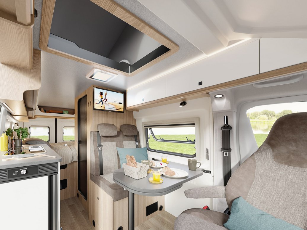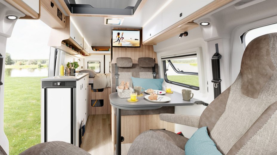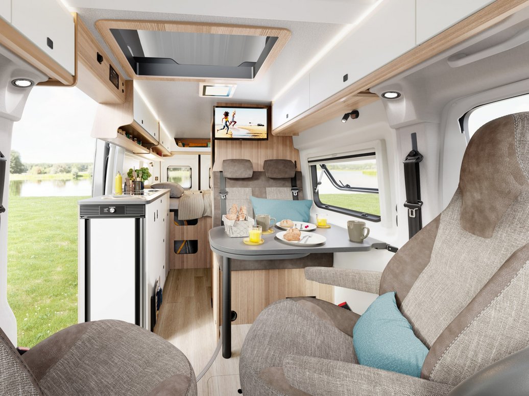 Auf nur 5,99 m Fahrzeuglänge hast du volle Gestaltungsfreiheit. Mit bis zu vier Plätzen im Fahrbetrieb, dem französischen Bett im Heck, zwei Schlafplätzen im Aufstelldach und Sitzbereich ohne Umbau findet die ganze Familie Platz. Im Handumdrehen ist das Aufstelldach aus- und wieder zusammengeklappt und dein Campervan innerhalb kürzester Zeit abfahrbereit. Denn eines ist sicher: Das nächste Abenteuer lässt nicht lange auf sich warten!
