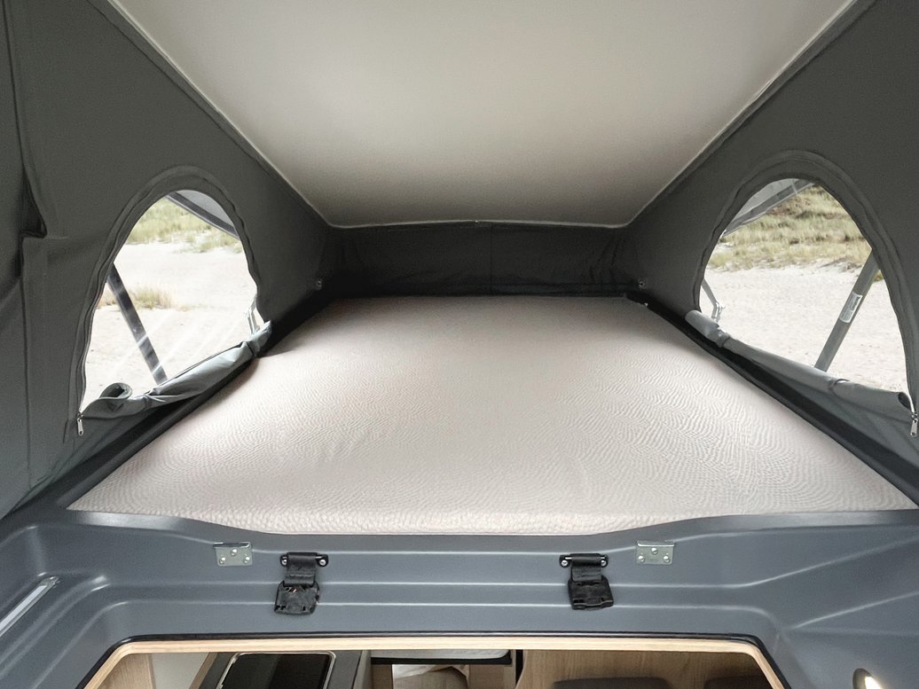 Das Aufstelldach entsteht in Zusammenarbeit mit Rocket Camper, einem der führenden Spezialisten für hochwertige Aufstelldächer. Die Aufstelldächer sind durch ihre Bauweise und die Materialauswahl sowohl robust, als auch sicher. Eine bewährte Hybridbauweise, bestehend unter anderem aus einer faserverstärkten Außenschale, Aluminium und Edelstahl, schützt das Aufstelldach gegen äußere Witterungsbedingungen. Das atmungsaktive Baumwollgewebe und die Isolation mit Armacell-Dämmstoff verleihen dem Inneren gleichzeitig ein angenehmes Raumklima.